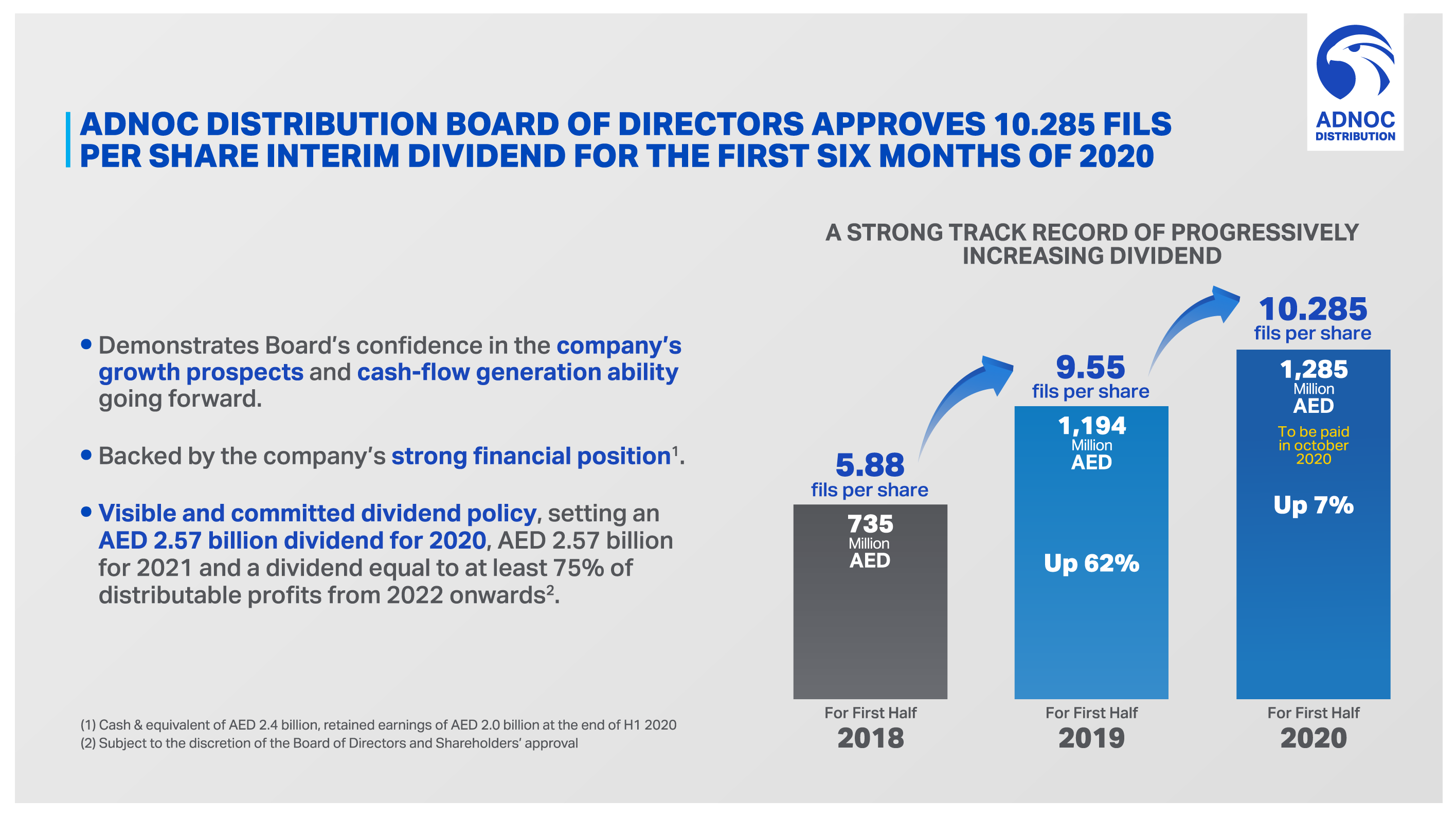 ADNOC Distribution (ISIN: AEA006101017) (Symbol: ADNOCDIST), the UAE’s largest fuel and convenience retailer, announced today the approval of an interim dividend payment to its shareholders for the first six months of 2020 of AED 1.285 billion (10.285 fils per share), equivalent to USD 350 million, approved at a meeting of the Board of Directors on 29 September 2020. This is the first payment in what is expected to be a full-year 2020 dividend payment of AED 2.57 billion (AED 20.57 fils per share), reflecting a 7% increase compared to last year’s dividend of AED 2.39 billion (19.10 fils per share). During its General Assembly meeting in March 2020, the company announced an amendment to its dividend policy for 2021 onwards, setting an AED 2.57 billion dividend for 2021 and a dividend equal to at least 75% of distributable profits from 2022 onwards, subject to the discretion of the Boardof Directors and the approval of shareholders. ADNOC Distribution expects to continue to pay half of the annual dividend in October of the relevant year and half in April of the following year. The new dividend policy demonstrates the company’s strong record of progressively increasing its dividends to its shareholders. As per the approved policy, the second and final dividend for 2020 is expected to be paid in April 2021, subject to the Board of Directors’ recommendation and shareholders’ approval. Despite the challenging operating environment the company has accelerated delivering on its strategic smart growth plans by opening 37 new stations in the UAE, as at end of September 2020, a seven times increase in new station openings when compared to last year, and remains on-track to deliver 50-60 new stations by full year 2020, including 20-25 new stations in Dubai. Ahmed Al Shamsi, Acting Chief Executive Officer of ADNOC Distribution, said: “Our progressive dividend policy demonstrates our commitment to our shareholders as we advance our strategic priorities of steady and sustainable growth, enhanced customer experience and attractive capital returns for our shareholders. With our resilient business model offering stable and predictable cash flows and low exposure to oil price volatility, we are confident in our ability to pay a generous dividend to our shareholders, while also maintaining significant capacity to deploy capital through a disciplined investment strategy aimed at continuing our efforts to expand our fuel station network, with a focus on the Dubai market, as well as investing in our non-fuel and international business expansion.” ADNOC Distribution maintains a strong balance sheet and remains well positioned to expand both its domestic and international portfolio in line with its smart growth strategy. As at 30 June 2020, ADNOC Distribution held AED 2.4 billion in cash and cash equivalents (including term deposits) and AED 2.8 billion in its unutilized revolving credit facilities. Although the COVID-19 pandemic caused unprecedented market conditions in the first half of the year, the Company demonstrated a resilient and steadfast focus on smart growth, delivering a 7.6% increase in underlying EBITDA for the first six months of 2020, compared to the first half of 2019. The company’s focus throughout the year has remained on providing a superior customer experience through enhancing its offering on multiple fronts; through refurbishing and modernising 41 of its convenience stores this year to date, bringing a fresh, engaging environment to its stores while also accelerating its e-commerce strategy and launching new services tailored to customer needs. The company has expanded its digital offering to include contactless payment solutions, online delivery from its convenience stores and mobile fuel and LPG delivery services via its digital application. At the end of July of this year, ADNOC Distribution launched the second phase of its ADNOC Rewards points-based loyalty program, the first loyalty programme of its kind in the region by a fuel provider. The program currently has more than 900,000 members. Earlier this month, ADNOC announced that it has successfully completed a placement of 1.25 billion of its shares in ADNOC Distribution with institutional investors. This represents 10% of ADNOC Distribution’s total share capital, and increases the Company’s free float to 20%, broadening the company’s shareholder base and allowing for greater liquidity of its shares on the Abu Dhabi Securities Exchange. This transaction leverages significant investor demand for ADNOC Distribution shares following a strong performance with a resilient dividend since its initial public offering in 2017. ADNOC Distributions equity case presents a unique opportunity for new investors to invest in a stable and profitable opportunity with an attractive and resilient dividend policy. Key Dates: Shareholders of ADNOC Distribution registered on 11 October 2020 (record date) will be entitled to receive the interim cash dividend, meaning the last day for purchasing shares and fulfilling the eligibility criteria is 7 October 2020. The payment itself is scheduled within 30 days from the date of the Board of Directors’ approval. Board of Directors’ approval 29 September 2020 Entitlement date (last day to purchase) 7 October 2020 Record date 11 October 2020 Dividend Payment 30 days from Board approval